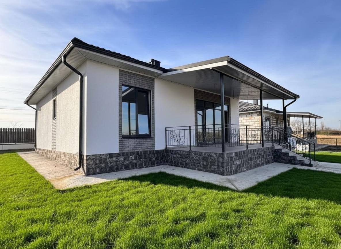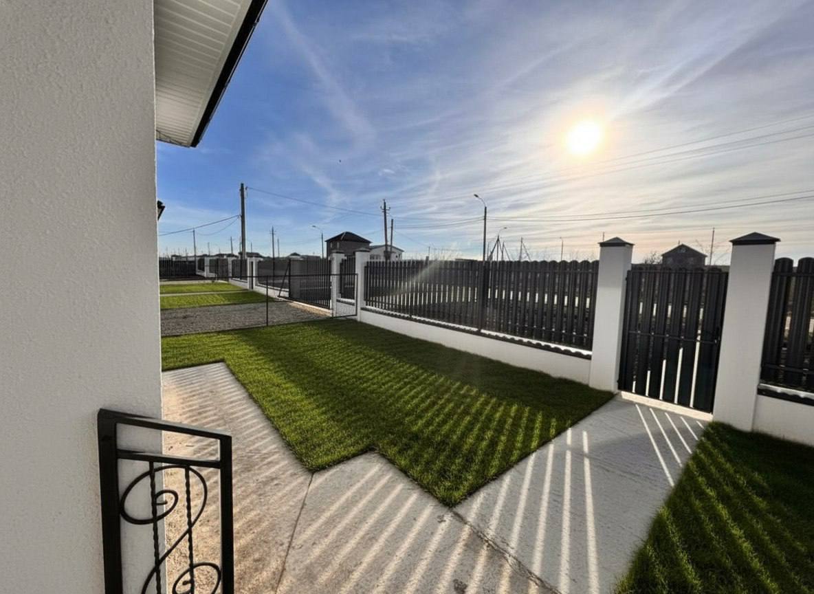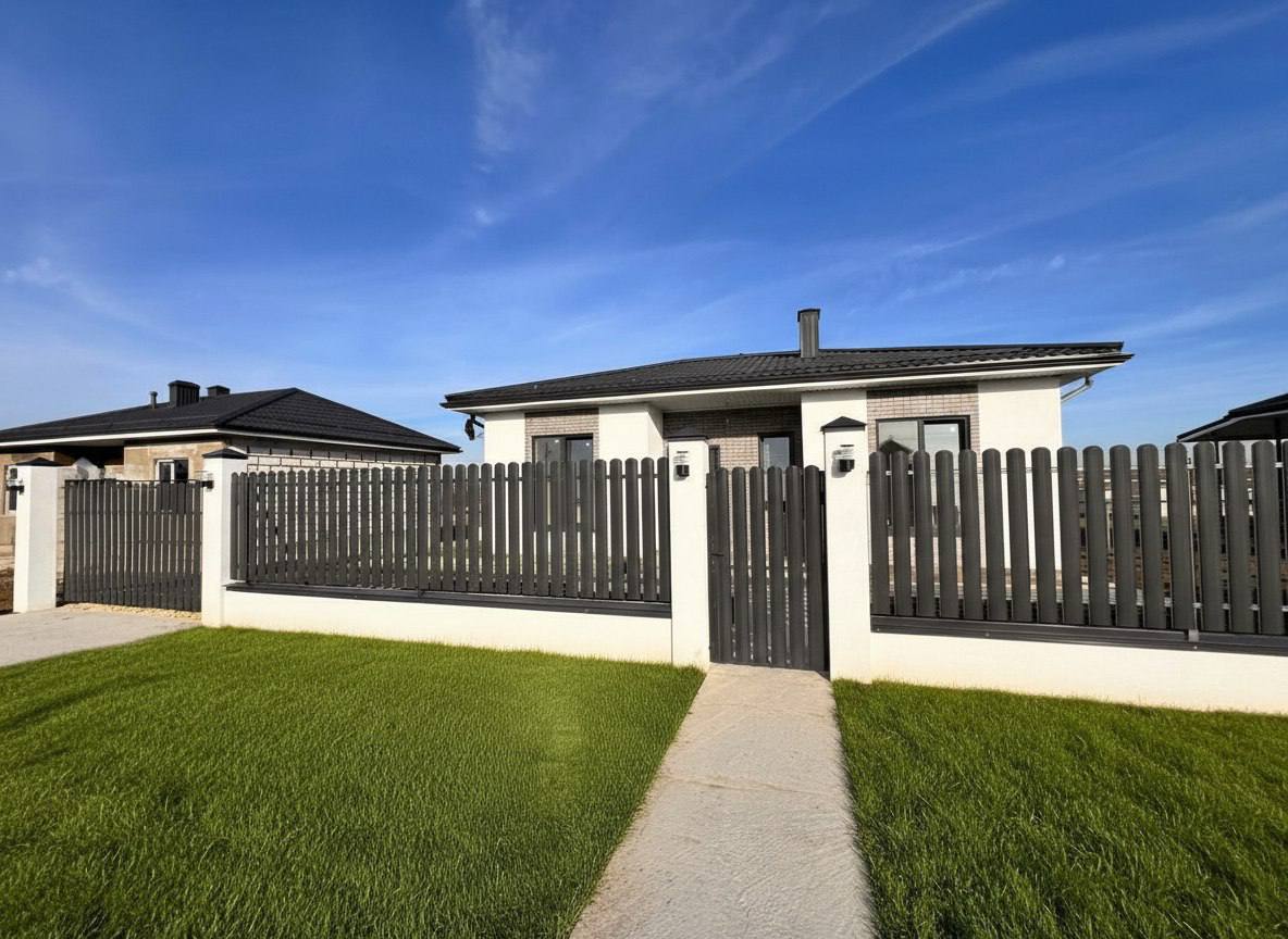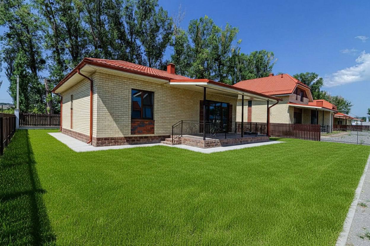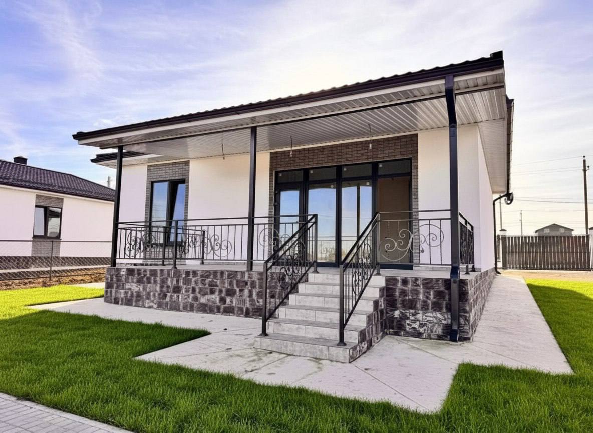 1-этажный дом с двумя спальнями, просторной кухней-гостиной с теплым полом, котельной, крыльцом и террасой с утепленной крышей, построенный на территории современного коттеджного поселка (благоустройство, инфраструктура, дороги, детские и спорт площадки).
