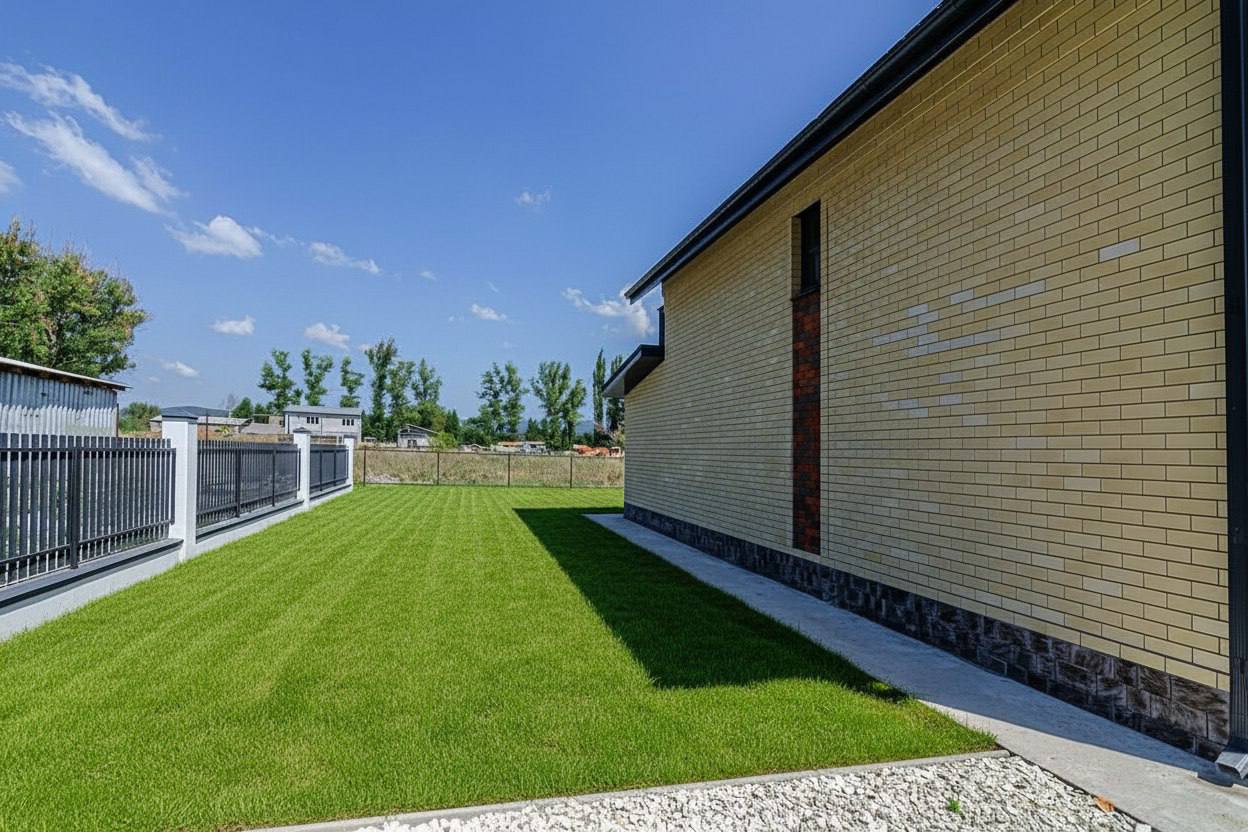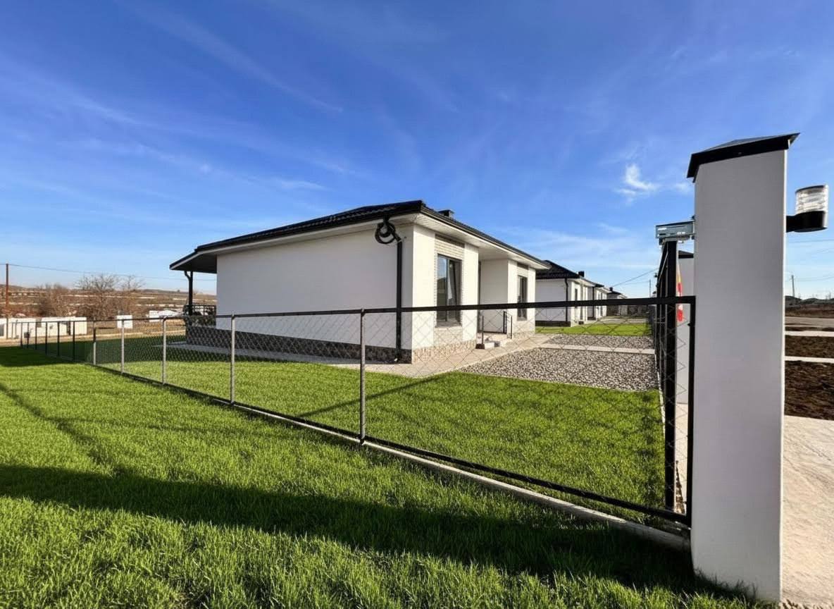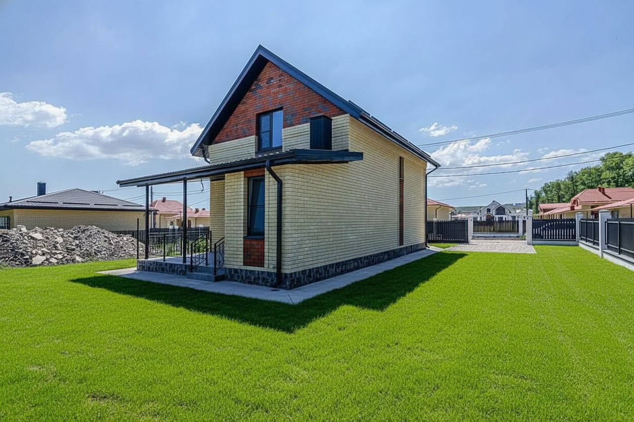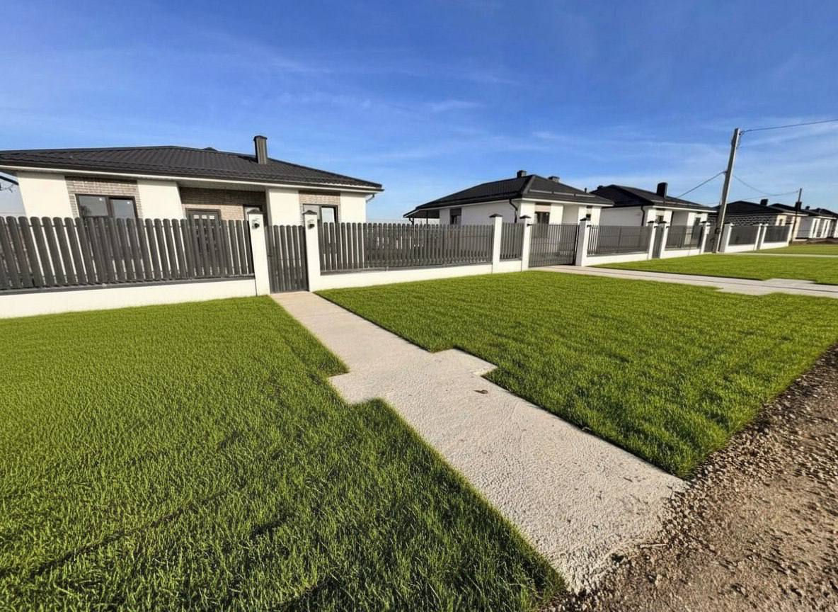 1-этажный дом с двумя спальнями, просторной кухней-гостиной с теплым полом, котельной, крыльцом и террасой с утепленной крышей, построенный на территории современного коттеджного поселка (благоустройство, инфраструктура, дороги, детские и спорт площадки).